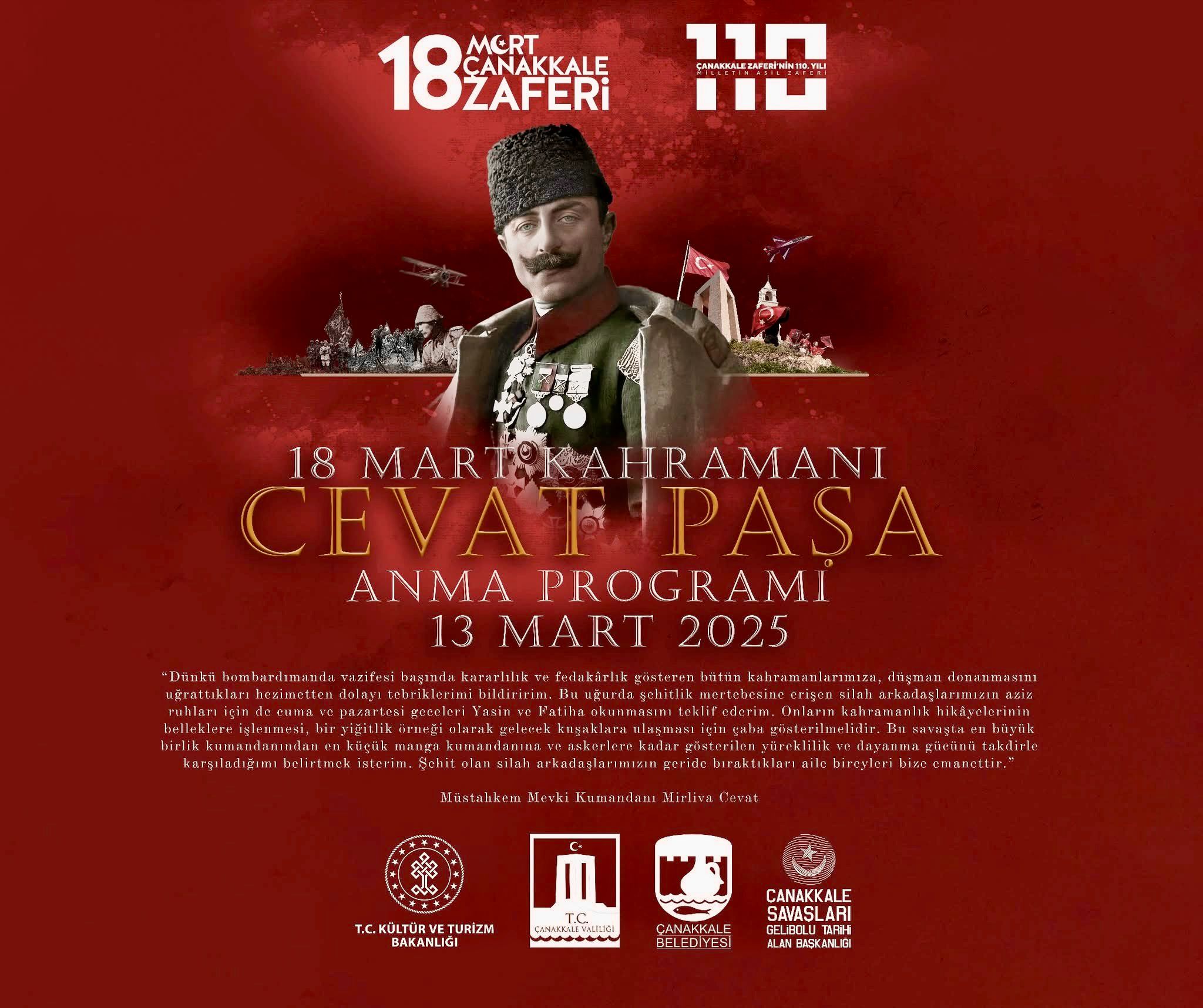 Çanakkale Zaferi’nin kahramanlık destanının önemli isimlerinden Müstahkem Mevki Komutanı Miralay Cevat Paşa için 13 Mart 2025 Perşembe günü saat: 11.00’de Cevatpaşa Parkı’nda anma programı düzenlenecek.