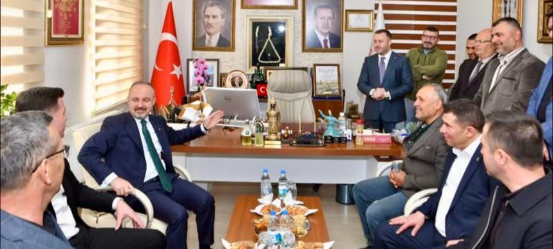 Ezine Belediye Başkanı Güray Yüksel’i belediye binasındaki makamında ziyaret eden İçişleri Bakan Yardımcısı Bülent Turan’ı belediye önünde köy muhtarları, belediye meclis üyeleri ve vatandaşlar karşıladı.