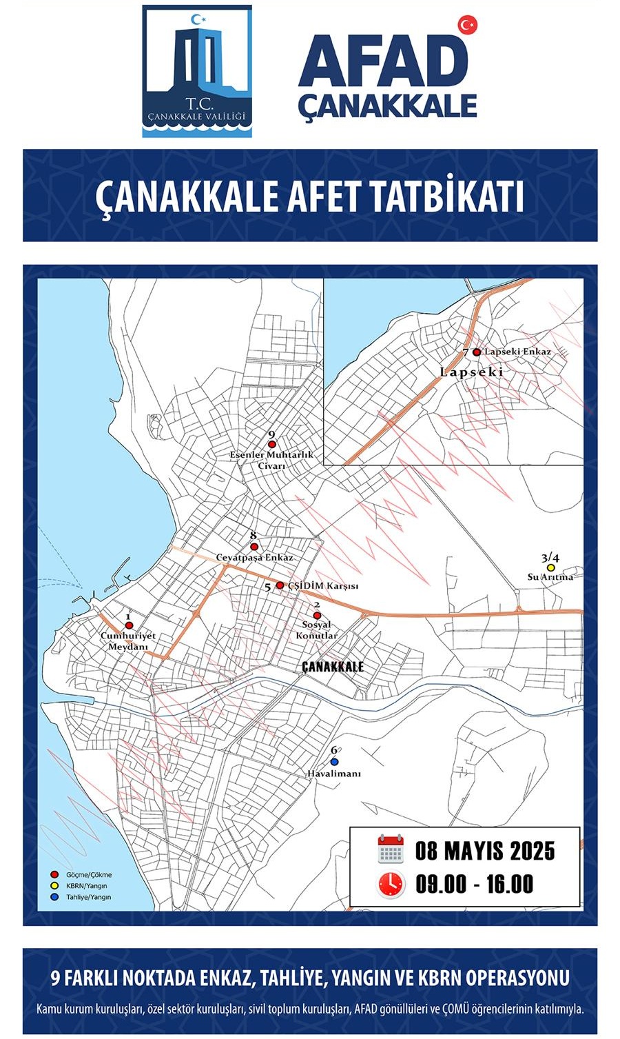 Tatbikatın, 8 Mayıs 2025 Perşembe günü, Çanakkale il genelinde belirlenen tatbikat alanlarında saat: 09.30 itibarıyla başlayacağı kaydedildi.