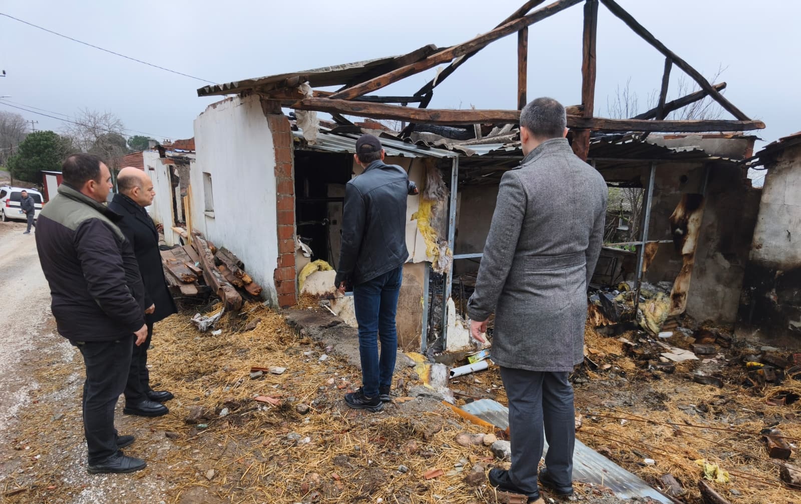 Çan Sosyal Yardımlaşma ve Dayanışma Vakıf Müdürü M. Ömer Yüksel ile birlikte Emekli Polis Memuru Ramazan Önder’in yanan evinde incelemelerde bulunan Çan Kaymakamı Dr. Emre Nebioğlu’na Karadağ Köy Muhtarı Barış Çalışkan ve Ramazan Önder’in oğlu Fatih Önder hazır bulundu.