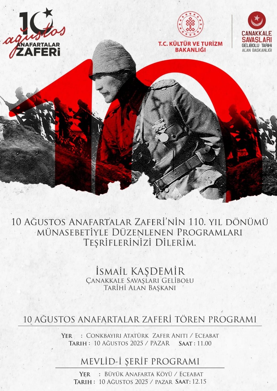 Conkbayırı Atatürk Zafer Anıtı’nda 10 Ağustos 2025 Pazar günü gerçekleştirilecek olan Anafartalar Zaferi 110. Yıl Dönümü Tören Programı kapsamında, ilk etkinlik saat: 11.00’de başlayacak.