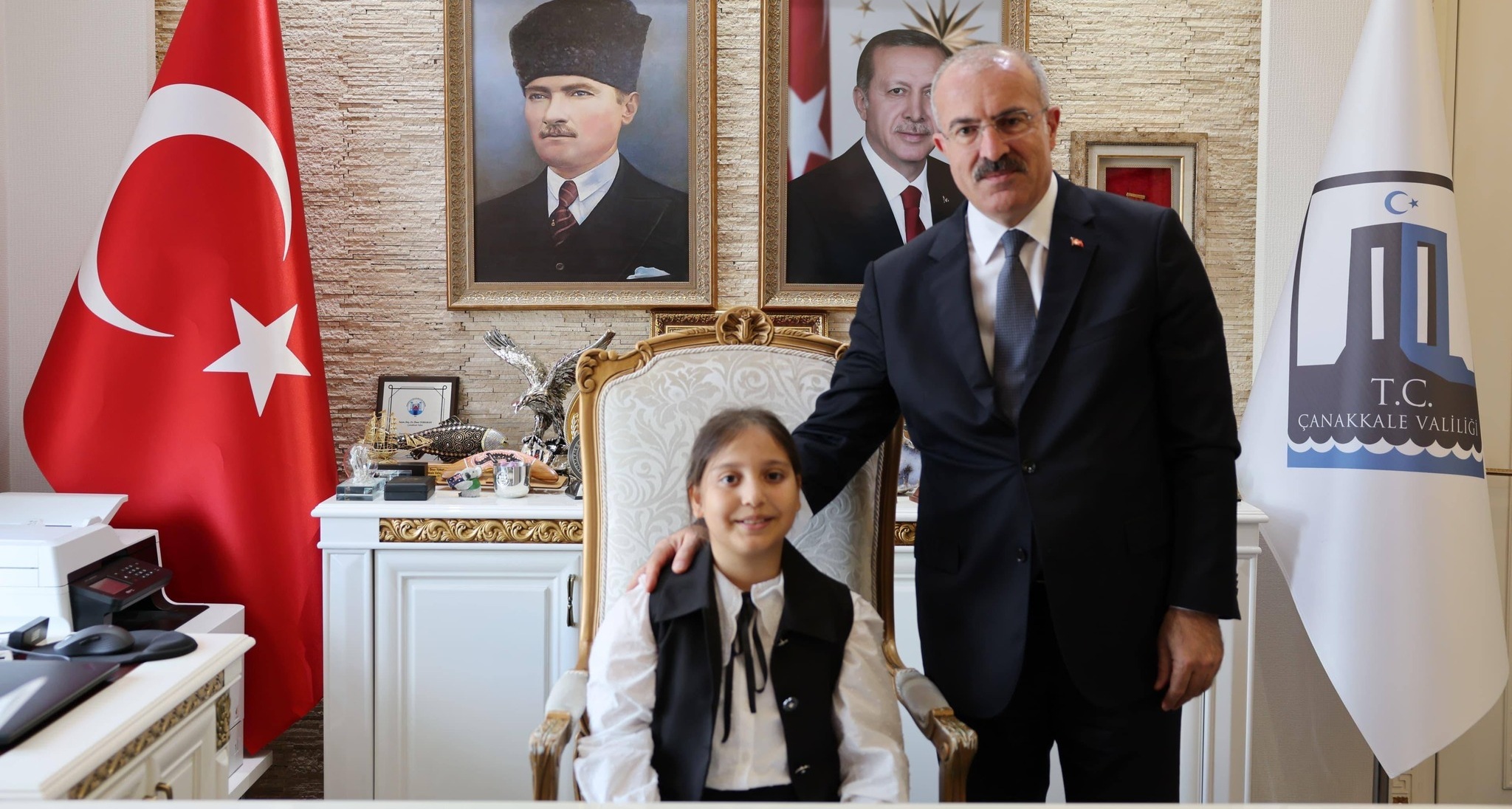 23 Nisan Ulusal Egemenlik ve Çocuk Bayramı dolayısıyla Mustafa Kemal İlkokulu öğrencilerini, sınıf öğretmeni Saynur Birgül, okul müdürü Mutlu Önder ve Çanakkale İl Millî Eğitim Müdürü Mine Hayta ile birlikte Valilik makamını devralan Beyza Yeşilyurt, Çanakkale Valisi Doç. Dr. Ömer Toraman ile birlikte makamda ağırladı.