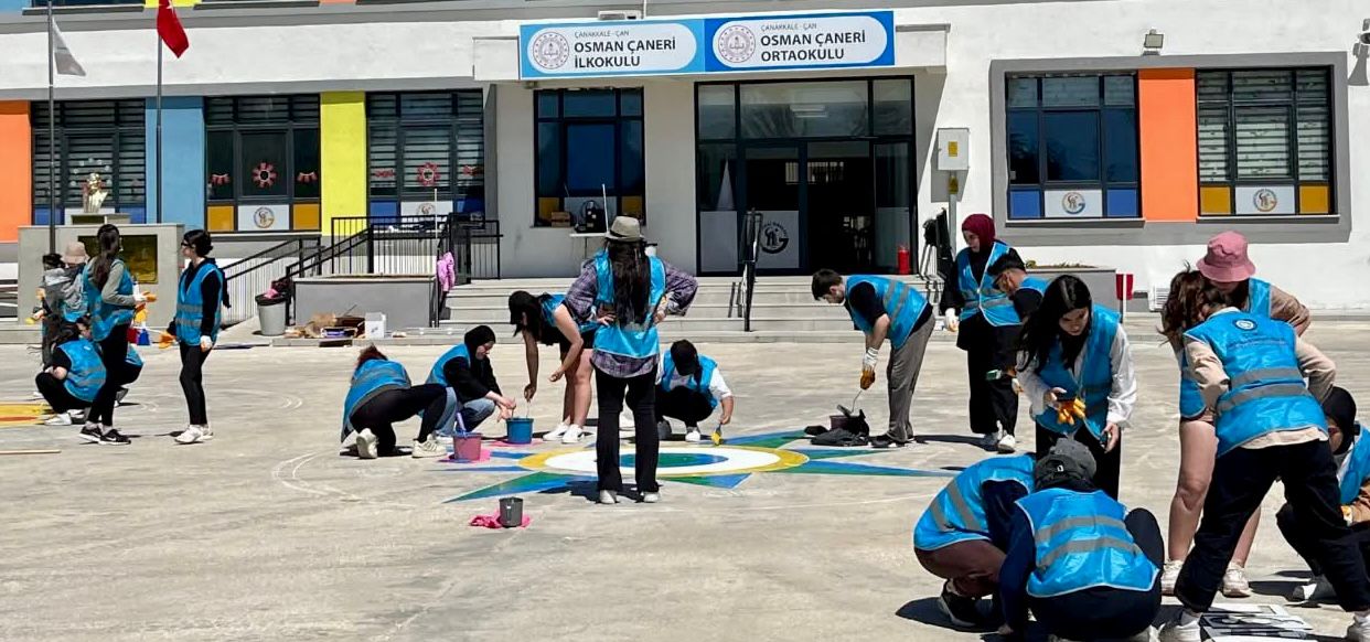 Okul yönetimi tarafından yapılan açıklamada; “Kale Grubu’nun desteği ile Çanakkale Onsekiz Mart Üniversitesi (ÇOMÜ) Sosyal Sorumluluk Proje Koordinatörlüğü ve Mimarlık ve Tasarım Fakültesi iş birliğinde okulumuzun bahçesini öğrencilerimiz için renklendik” denilerek, “Proje kapsamında Arş. Gör. Dr. Merve Temiz Topsakal’ın teknik çizimleriyle üniversiteli 40 kişilik gönüllü öğrenci grubu okulumuzun bahçesinde oyun alanı çizdi. ÇOMÜ Rektör Yardımcısı Prof. Dr. Evren Karayel Gökkaya, MTF Dekan Yardımcısı Dr. Öğr. Üyesi Necla Ece Öncül, Kale Sosyal Sorumluluk Kulübünden Zafer Erdinç ve Pınar Uçar, ÇOMÜ Sosyal Sorumluluk Kordinatörü Doç. Dr. Hicran Özlem İlgin, Koordinatör Yardımcısı Prof. Dr. Nazan Çalbayram, Çan İlçe Milli Eğitim Müdürümüz Fuat Kılıçarslan ve gönüllü üniversiteli öğrencilere gönülden teşekkür ederiz” ifadelerine yer verildi.