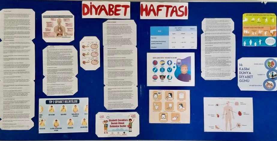 ”Okulda Diyabet Eğitimi” konulu videolar izletilerek diyabet hakkında bilgilendirme yapılırken Sağlık Hizmetleri Alanı öğretmeni Çiğdem Kılıçaslan ve öğrencileri tarafından “Okulumda Sağlıklı Besleniyorum Programı” kapsamında pano da düzenlendi.