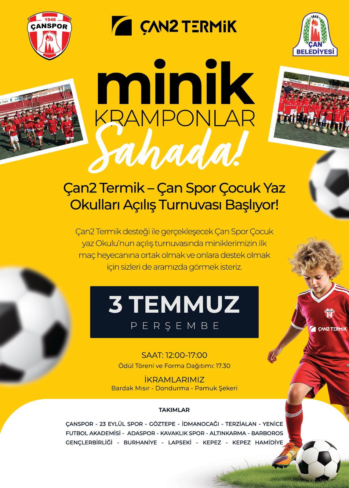 Çan2 Termik Santrali’nin katkılarıyla dört yıldır düzenlenen Çan Spor Çocuk Yaz Okulları, bu yıl da çocukları sporla buluşturuyor. Yaz okullarının açılışı, 3 Temmuz 2025 Perşembe günü gerçekleştirilecek “Minik Kramponlar Yaz Okulu Açılış Turnuvası” ile yapılacak. Saat 12.00-17.00 arasında düzenlenecek turnuvada, minik sporcular yeteneklerini sergileyecek. Turnuva Müsabakaları 12.00-17.00 arasında olacak. Ardından saat 17.30’da ödül töreni ve forma dağıtım etkinliği ile sona erecek.
