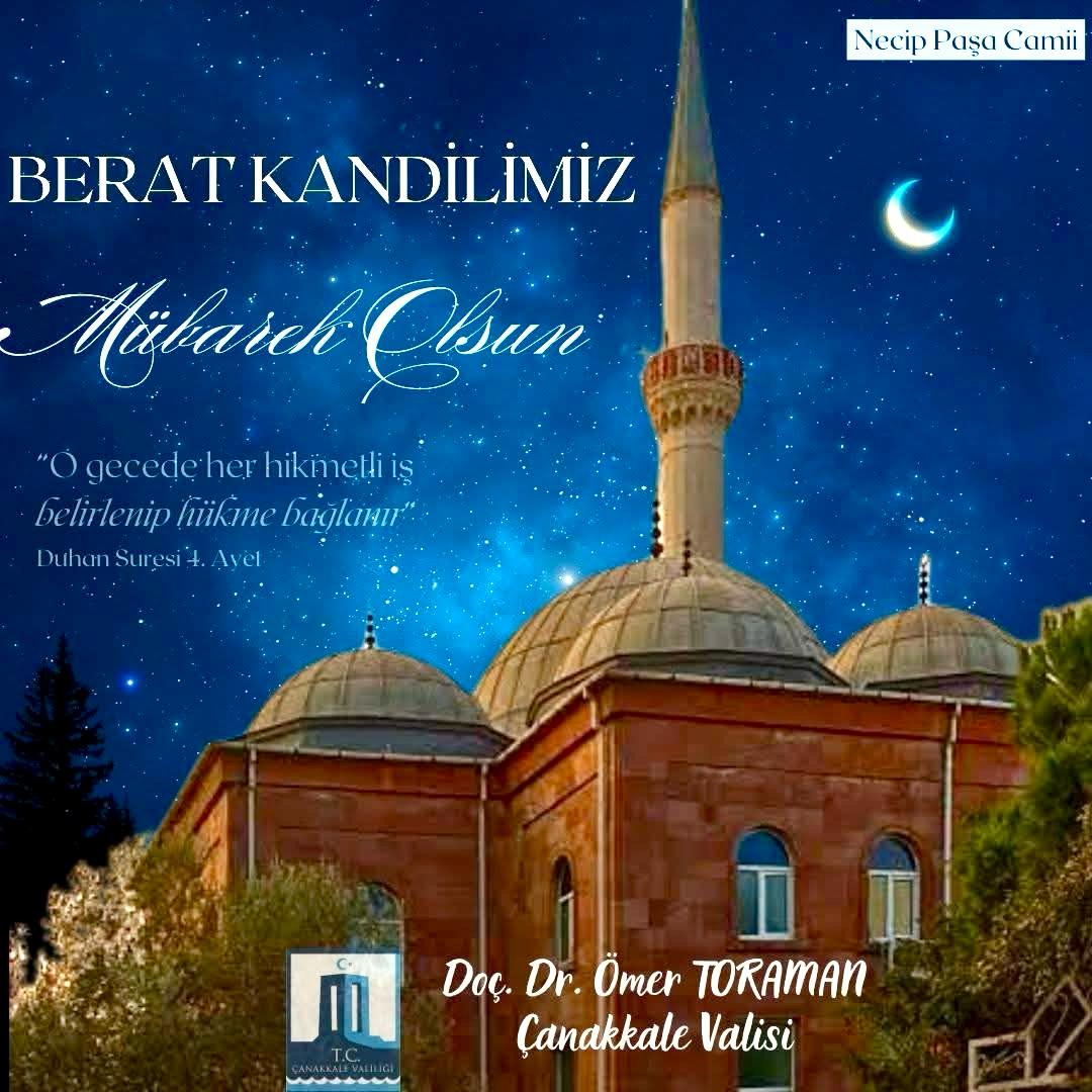 Çanakkale Valisi Doç. Dr. Ömer Toraman, “Berat Kandili” nedeniyle  bir kutlama mesajı yayımladı.