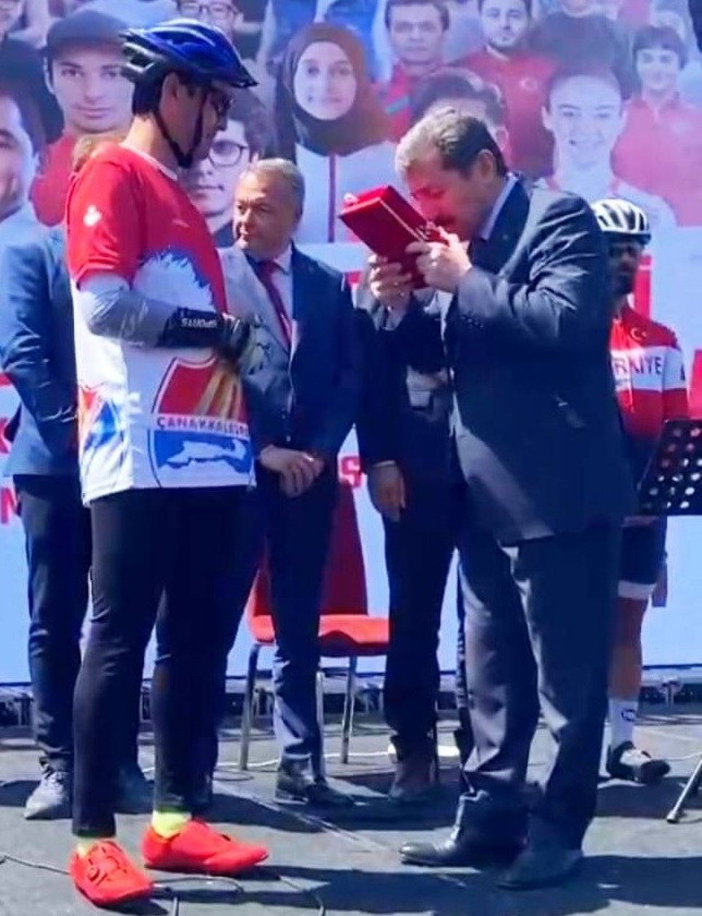 İki hafta önce 7 Mayıs’ta Çanakkale’den başlattığı iki bin kilometrelik 19 Mayıs Milli Mücadele Rotası bisiklet yolculuğunda Samsun’a ulaşan Murat Tecimen, 19 Mayıs Atatürk’ü Anma Gençlik ve Spor Bayramı kutlama töreninde Çanakkale Valisi Doç. Dr. Ömer Toraman’dan aldığı Türk Bayrağını ve 57.Alay Şehitliği’nden aldığı toprağı; Çanakkale’nin geçmiş dönem valilerinden, şimdiki Samsun Valisi Orhan Tavlı’ya teslim etti.