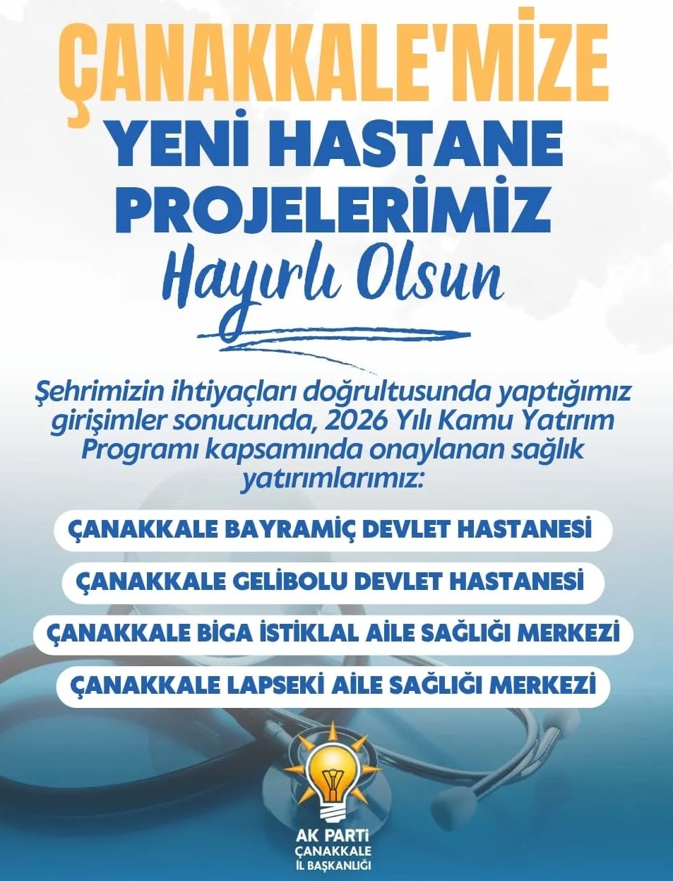 AK Parti Çanakkale İl Başkanlığından yapılan yazılı açıklamada; ” Şehrimizin ihtiyaçları doğrultusunda yaptığımız girişimler sonucunda, 2026 Yılı Kamu Yatırım Programı kapsamındaki onaylanan sağlık yatırımlarımız;