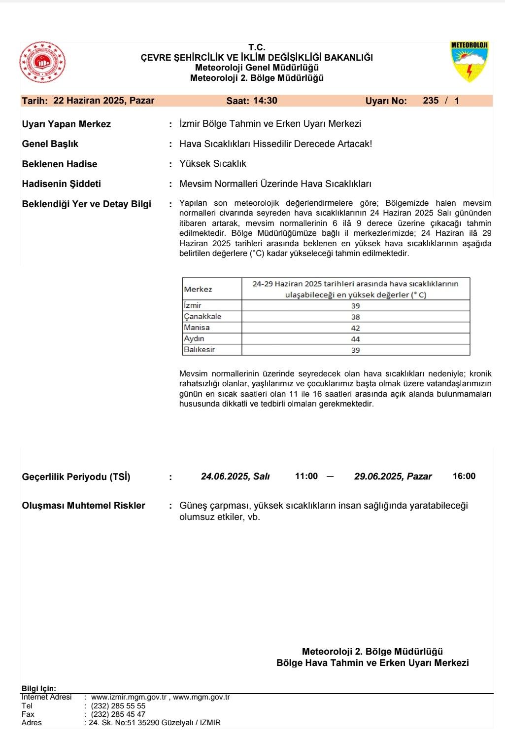 ⚠️ Vatandaşlarımızın, sıcak havalarda sağlık problemleri ve orman yangını riskine karşı dikkatli ve duyarlı olmaları büyük önem arz etmektedir.