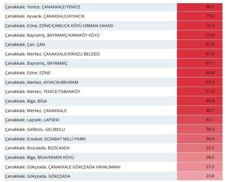 Yenice’yi 79 kilogram ile Ayvacık, 76,3 kilogram ile Ezine Çamlıca köyü orman sahası ve 75 kilogram ile Bayramiç’in Karaköy köyü takip etti. Çan’da ise 67,9 kilogram yağış düştü.
