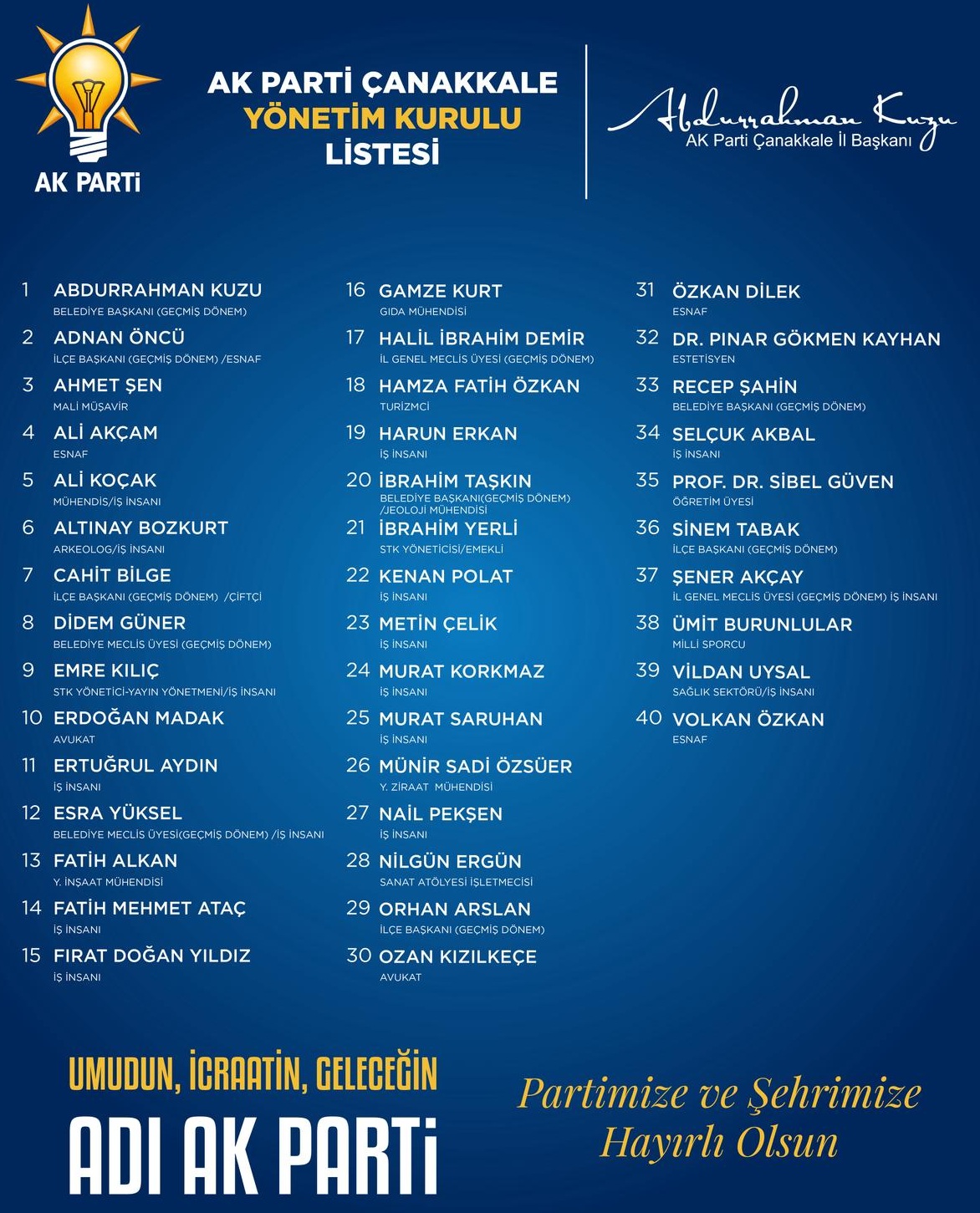 “Yeni Dönem, Güçlü Kadro: Ak Parti Çanakkale’yi Zirveye Taşıyacak” diyen AK Parti Çanakkale İl Başkanı Abdurrahman Kuzu, yönetim, iş dünyasından akademiye, yerel yönetimlerden parti kurucularına kadar geniş bir yelpazede güçlü isimleri bir araya getirdiklerini kaydederek, açıklamasında şu ifadeleri kullandı: