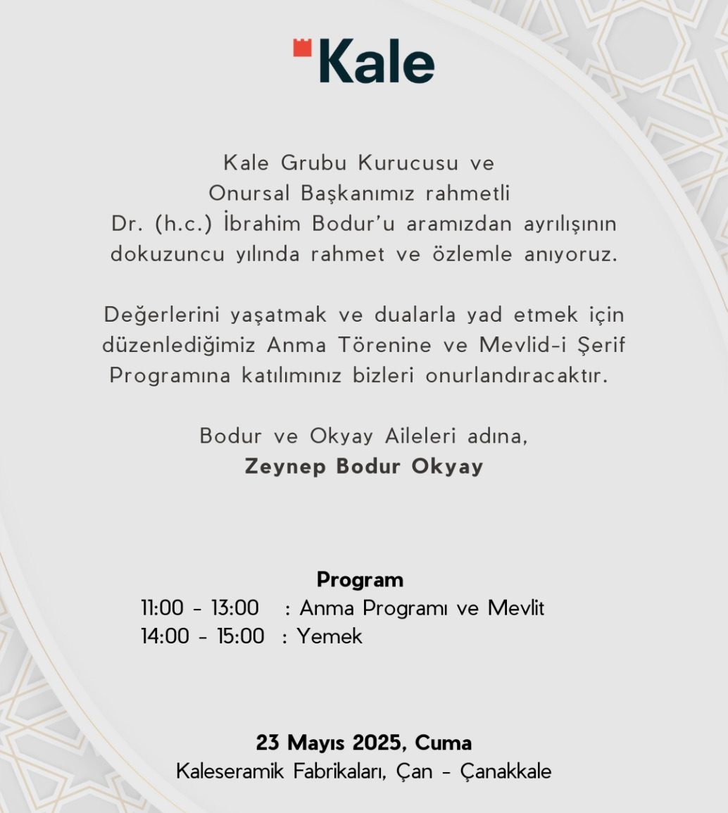 Kale Grubu, İbrahim Bodur’un aziz hatırasını yaşatmak için bu yıl da bir anma programı düzenledi. Çan’da gerçekleşecek ve online bağlantı ile katılım sağlanacak anma töreni ve mevlid-i şerif programı, 23 Mayıs Cuma günü saat 11.00’de başlayacak.