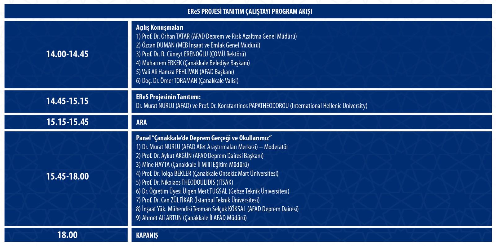Çanakkale Valisi Doç Dr. Ömer Toraman, AFAD Başkanı Ali Hamza Pehlivan ve Çanakakle Onsekiz Mart Üniversitesi Rektörü (ÇOMÜ) Prof. Dr. R. Cüneyt Erenoplu’nun katılacağı “Depreme Dirençli Okullar-Earthquake Resilient Schools-EReS Projesi” kapsamında gerçekleştirilecek “Çanakkale İlinin Deprem Tehlikesi ve Depreme Dirençli Okullar” başlıklı çalıştay, ÇOMÜ Terzioğlu Yerleşkesi Troia Kültür Merkezinde 27 Şubat 2025 Perşembe günü saat. 14.00-18.00 arasında düzenlenecek.