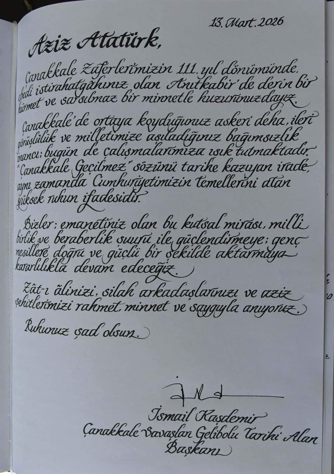 18 Mart Şehitleri Anma Günü ve Çanakkale Deniz Zaferi Haftası çerçevesinde Çanakkale Savaşları Gelibolu Tarihi Alan Başkanı İsmail Kaşdemir’in Anıtkabir Mozolesi’ne çelenk koyan Alan Başkanı İsmail Kaşdemir, Misakı Milli Kulesi’ndeki Anıtkabir Özel Defteri’ni imzaladı.