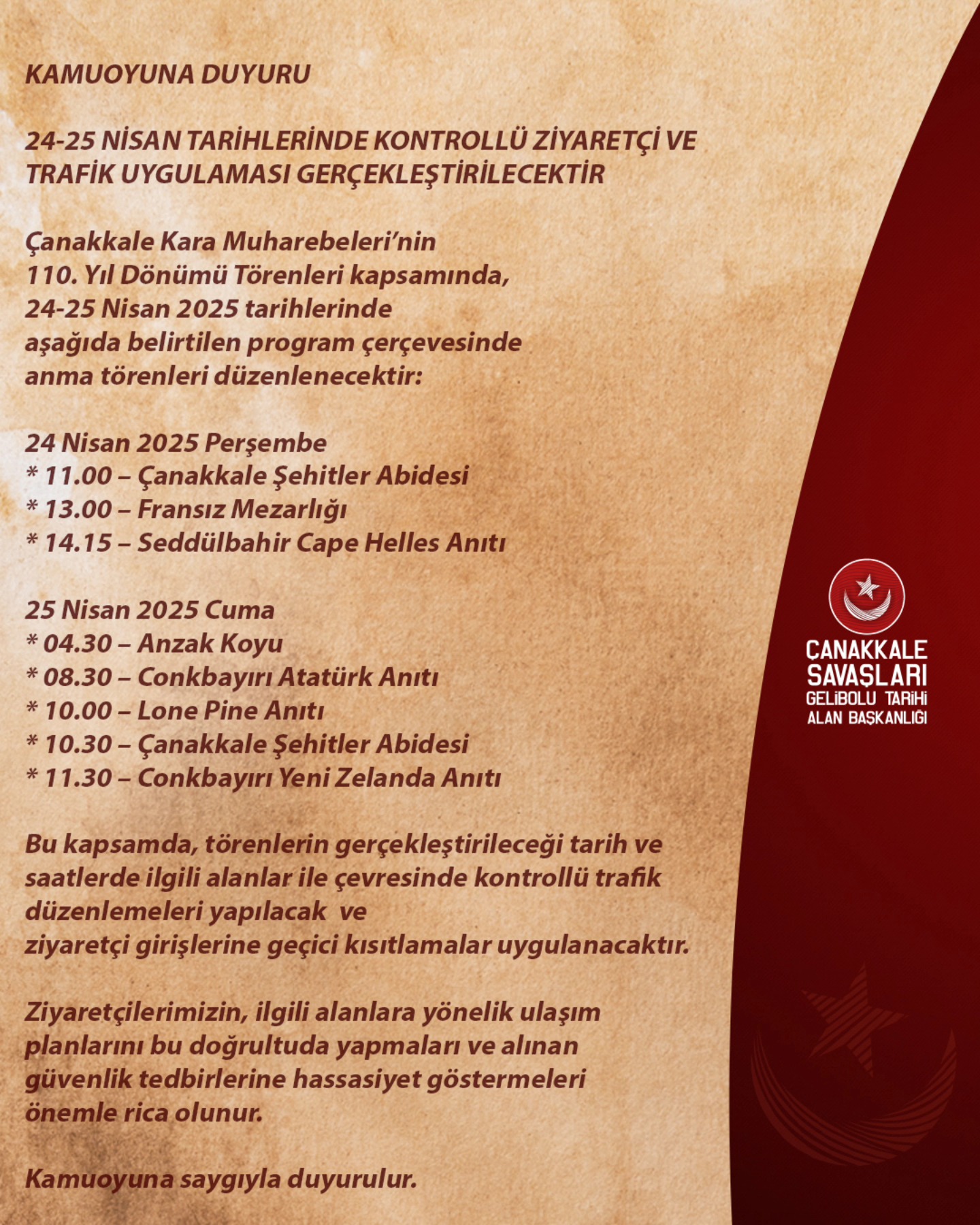 Çanakkale Kara Muharebeleri’nin 110. Yıl Dönümü Törenleri kapsamında, 24-25 Nisan 2025 tarihlerinde belirtilen program çerçevesinde anma törenleri düzenleneceği ve bu program çerçevesinde Tarihi Alan’da kontrollü ziyaretçi ve trafik uygulaması olacağı bildirildi.