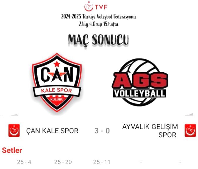 Çan Şehit Halil İbrahim Eriç Spor Salonu‘nda Çan Kale Spor ile Ayvalık Gelişim Spor (AGS) arasındaki mücadeleden ev sahibi Çan Kale Spor 3-0 galip ayrılarak ilk galibiyetini almış oldu.