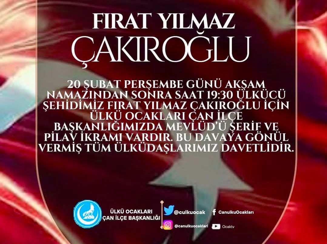 Ülkücü Şehit Fırat Yılmaz Çakıroğlu’nun ruhu için okunacak Mevlid-i Şerif, Ülkü Ocakları Çan İlçe Başkanlığında Akşam Namazı sonrasında başlayacak.